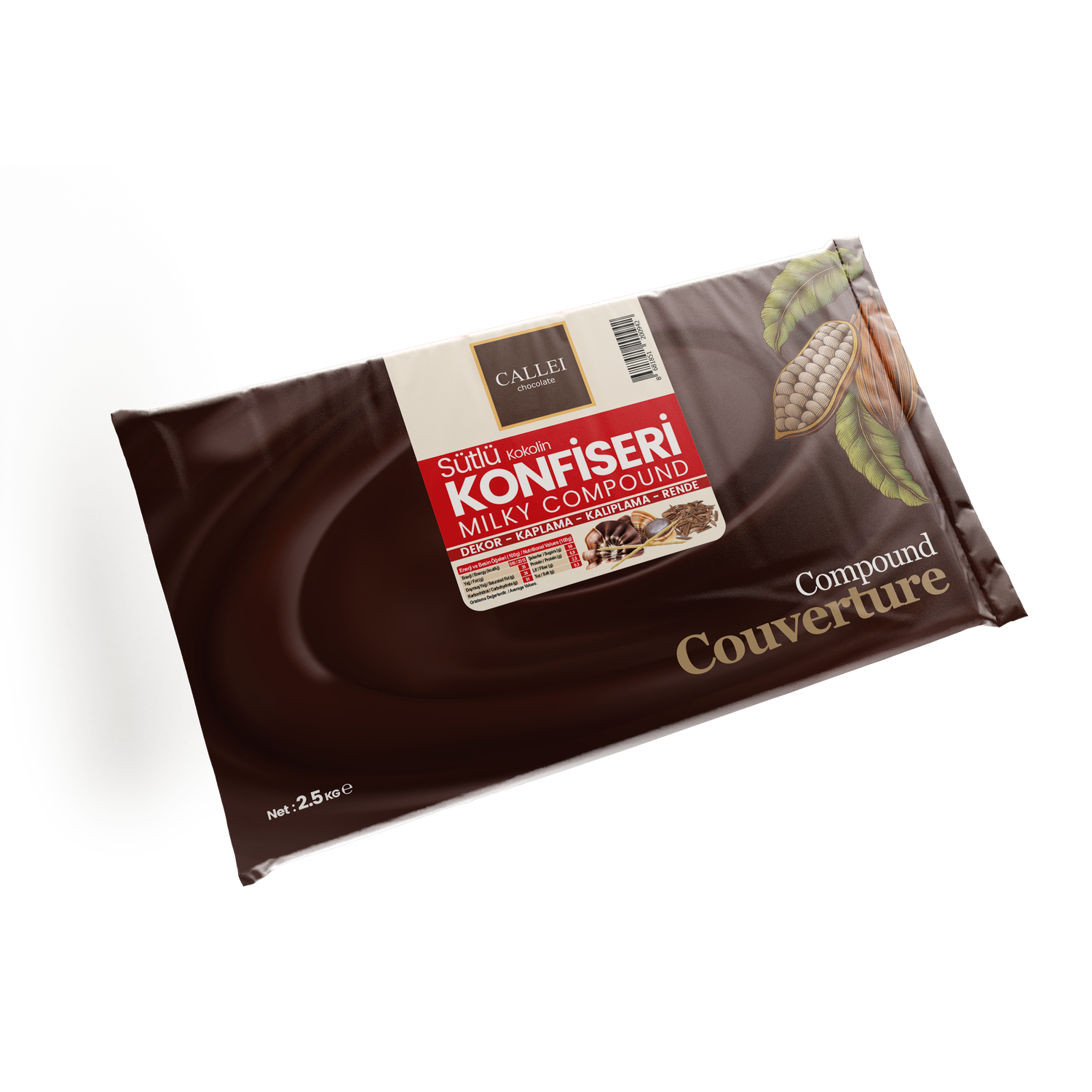 The cornerstone of popular confectionery, Callei's **Milky Chocolate Compound** delivers the universally loved, comforting taste of classic milk chocolate in a high-performance 2.5kg format. Designed for B2B use, it guarantees consistent quality and efficient processing for all your molding and enrobing needs.